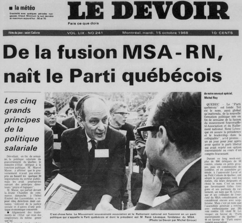Lors d'un congrès de quatre jours qui se déroule au petit Colisée de Québec, le Mouvement souveraineté-association (MSA) de René Lévesque et le Ralliement national (RN) de Gilles Grégoire fusionnent pour fonder une nouvelle formation politique indépendantiste : le Parti québécois (PQ).